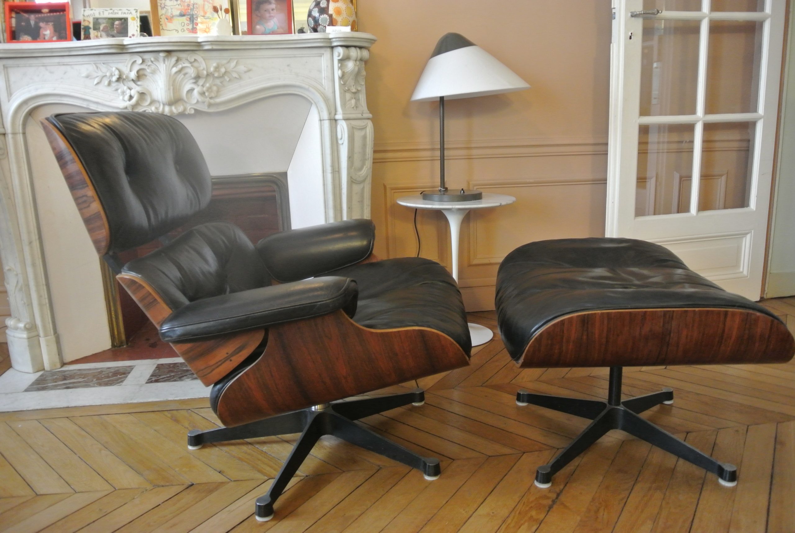 Fauteuil lounge chair de Charles et Ray Eames avec son ottoman, édition Herman Miller pour Mobilier international, création en 1958. Modèle de la fin des années 60.