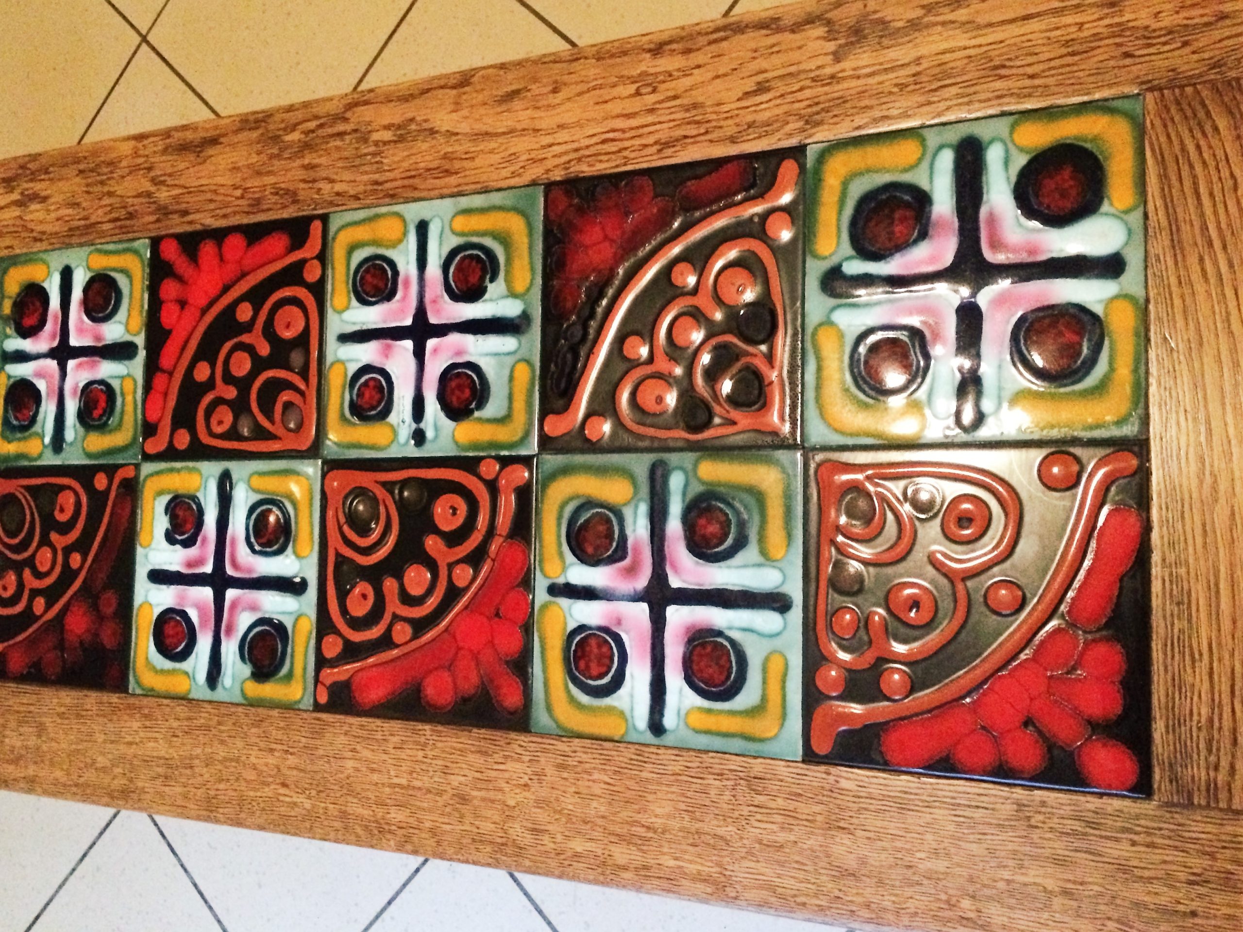 Très belle table de salon design modèle Thibault de Guillerme et Chambron, années 50 en chêne et belles céramiques.