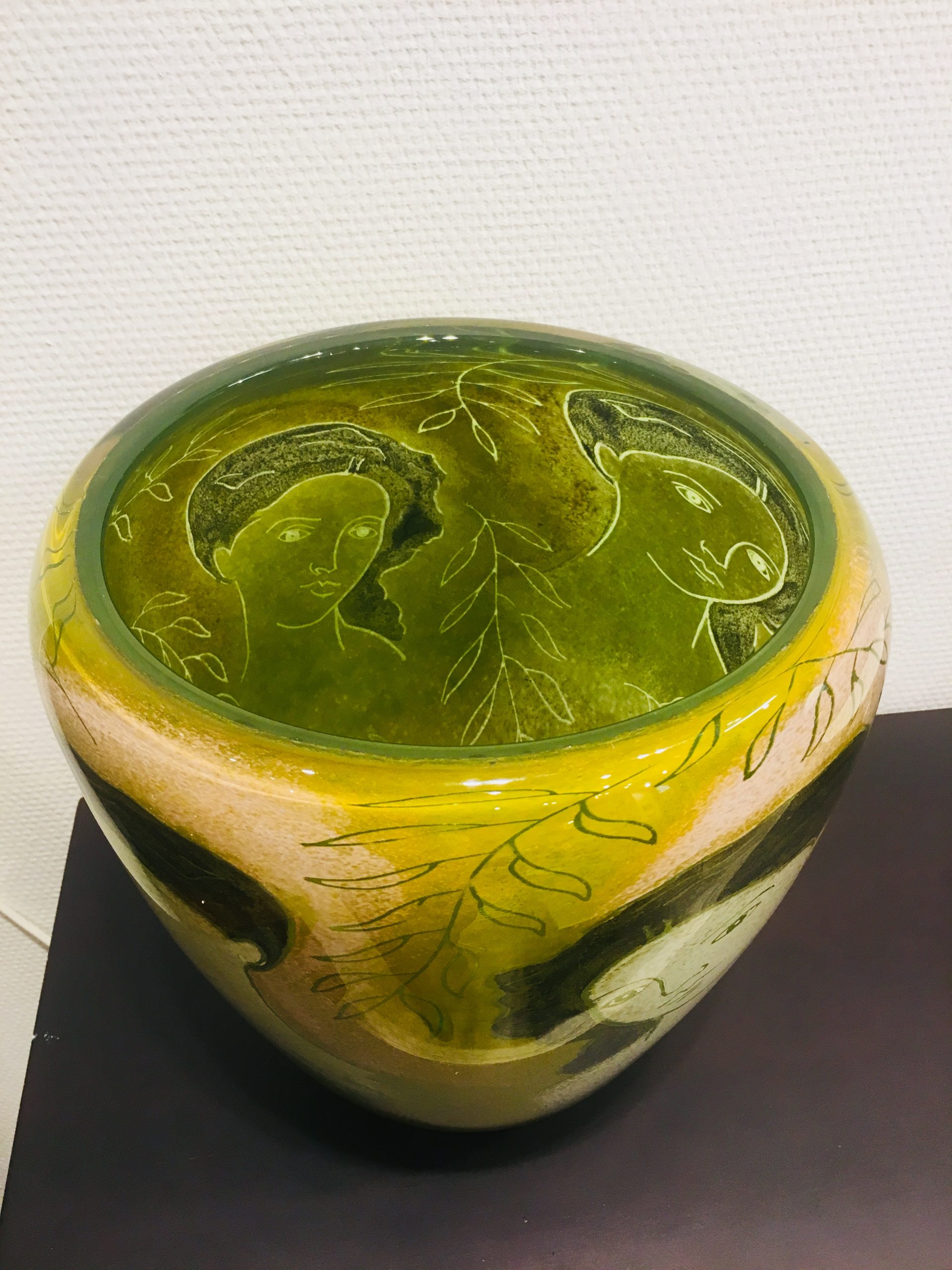 Ce grand vase cornet, “Femmes et rameaux d’oliviers” tout en finesse, est signé LOUMANI , circa 1995